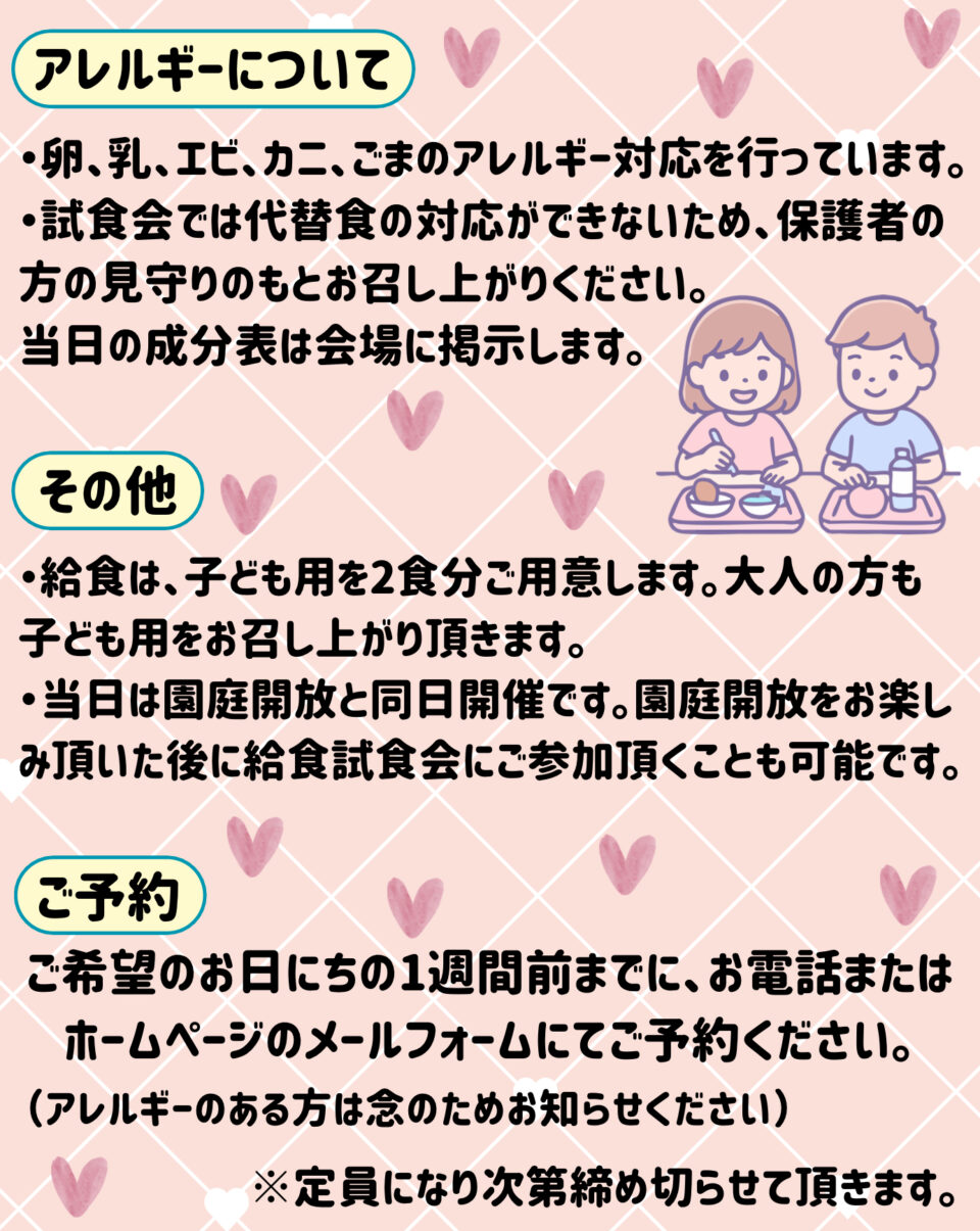 当日は園庭開放と同日開催のため、園庭で遊んだ後にそのまま給食試食会へご参加いただけます😉もちろん試食会のみのご参加でも大丈夫です🌟園の雰囲気や給食の時間を体験していただくことで、入園後の生活をイメージしていただければと思います🌈ぜひお気軽にご参加ください💖
